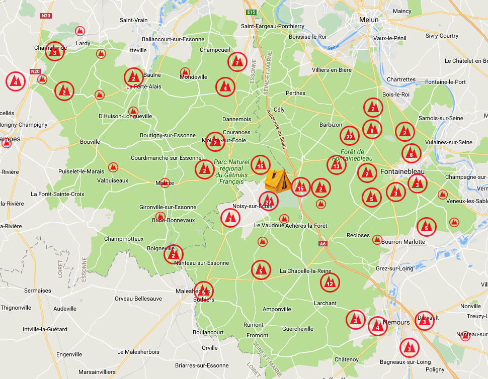 Ci-dessus, en chiffre: le nombre se zone de rochers à grimper dans la forêt de Fontainebleau. Tente jaune = le camping de la Musardière.